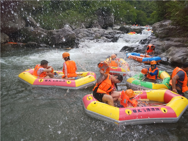 百丈飛瀑漂流全程約3公里,驚險(xiǎn)刺激河段達(dá)10余處,整個(gè)過(guò)程中,很多家人尖叫連連。超大的水流和家人們的“暗算”,讓每個(gè)人都濕了身,互相打鬧、追逐還擊的場(chǎng)面好不熱鬧,放下緊張的心情,同博物業(yè)一家人盡情的享受著這一刻。
